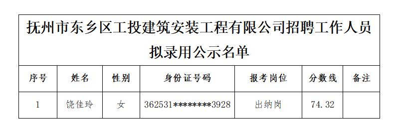 撫州市東鄉(xiāng)區(qū)工投建筑安裝工程有限公司招聘工作人員擬錄用公示