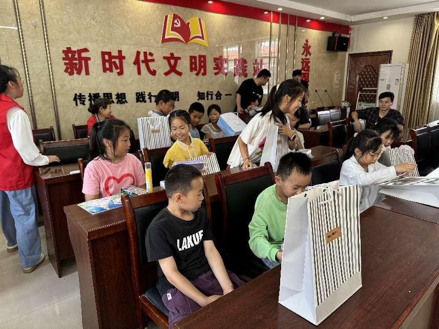 最后,黨員同志們?yōu)榱羰貎和l(fā)放愛心文具包。孩子們手提禮袋,臉上洋溢出幸福的笑容。