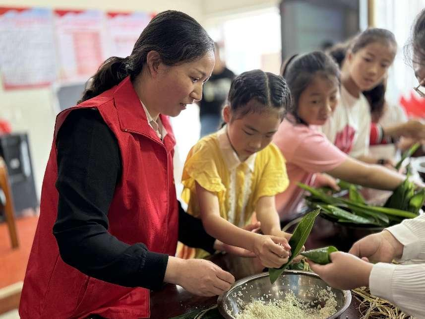 隨后,黨員同志們分發(fā)提前準備好的糯米、粽葉等,與孩子們圍坐在一起,挑粽葉、折粽葉、舀糯米、系粽繩……有的巧手翻飛、嫻熟地包著粽子,有的邊看邊學(xué)、逐漸熟練,不多時,一個個粽子就包好了,現(xiàn)場歡笑聲不斷。